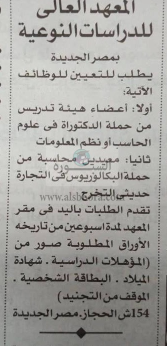 المعهد العالى للدراسات النوعية يعلن عن حاجته الى اعضاء هيئة التدريس ومعيدين.. ننشر نص الاعلان