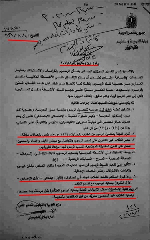 الى جميع مديرى المدارس.. الكتاب الدورى رقم 41 بشأن تحصيل الرسوم المدرسية للطلاب الجدد