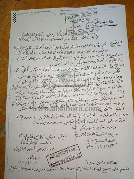 قال الدكتور مصطفى رجب استاذ اساتذة اللغة العربية ، بعد ما نشرناه نحن وغيرنا عما في امتحان اللغة العربية للثانوية العامة من " بوائق" حاولوا استدراك الموقف فصيغت هذه المذكرة على عَجَل وعُرِضت بخط اليد [ الجميييييييل !! ] الذي ترونه ، وقد ووفق عليها وتم تعميمها .