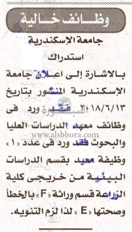 تعلن جامعة الاسكندرية عن حاجتها الى اعضاء هيئة التدريس، وعلى الراغبين فى التقدم تسليم الملفات باسم عميد الكلية على ان يكون خلال 15 يوما من تاريخ نشر الاعلان.