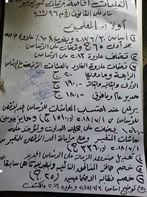 وفقا للقرارات الصادرة من السيد رئيس الجمهورية رقم 96 لسنة 2018 ، باضافه العلاوة للخاصه والعلاوة الاستثنائية بجانب اضافه علاوة 2013 وقيمتها 10 % من اساسى 2013 ،اصدرت المديريات التعليميه تعليماتها بصرف مفردات المرتب للمعلمين والاداريين بجميع الادارات التعليميه لتكون الزيادات كالتالى :