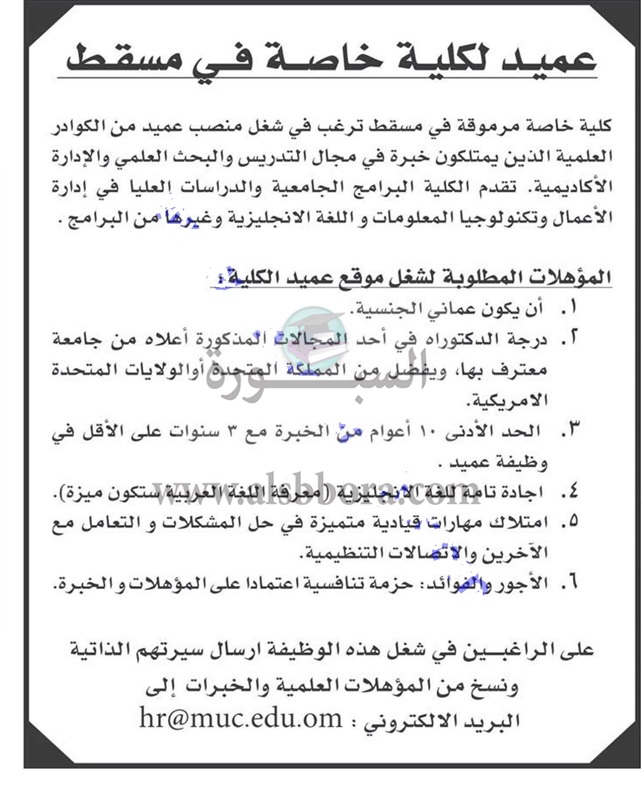تعلن كبرى الكليات الخاصة بسلطنة عمان عن حاجتها الى عميد كلية، وعلى الراغبين فى التقدم ارسال السيرة الذاتية عبر الايميل المنشور فى الاعلان التالى: