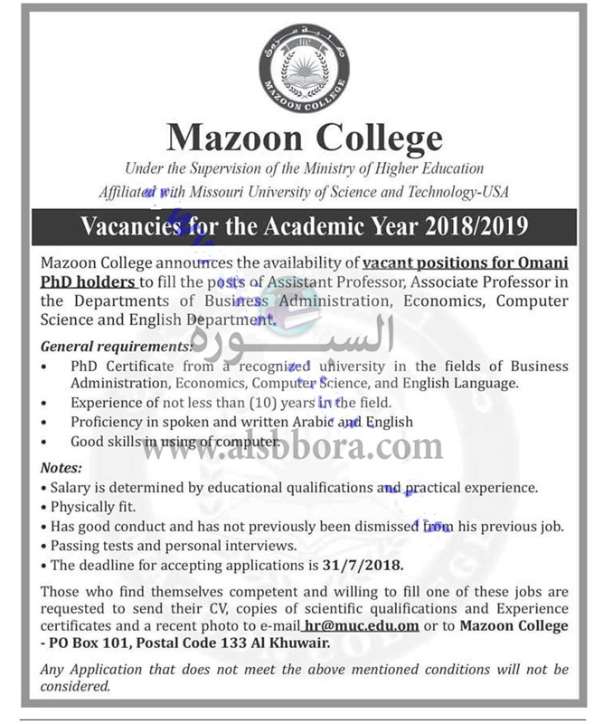 تعلن سلطنة عمان عن حاجتها الى اعضاء هيئة التدريس، وعلى الراغبين فى التقدم ارسال السيرة الذاتية عبر الايميل المنشور فى الاعلان التالى: