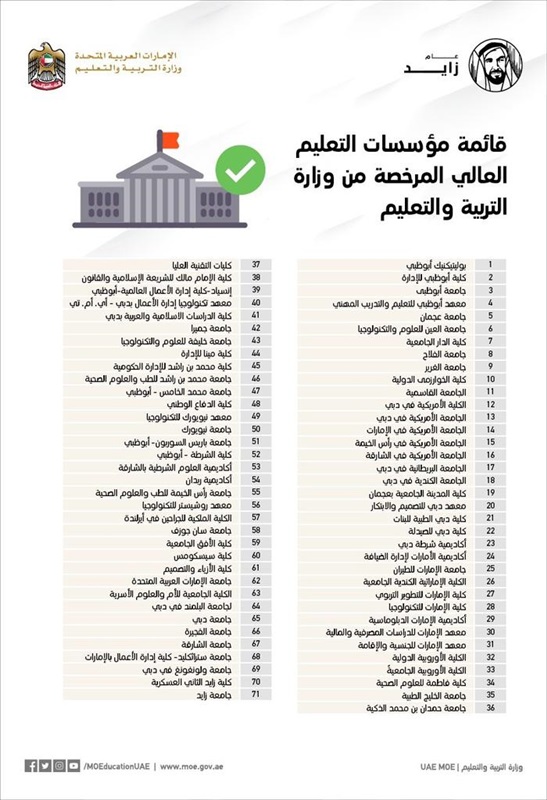 نشرت وزارة التربية والتعليم الاماراتية على حسابها في تويتر قائمة مؤسسات التعليم العالي المرخصة من وزارة التربية والتعليم .