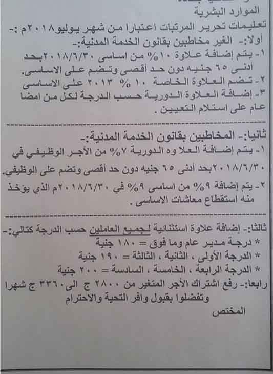 يتم صرف راتب شهر يوليو لهذه الفئة من الموظفين عن طريق اضافة علاوة 10% من أساسي 30/6/2018 بحد أدني 65 جنيه دون حد أقصي وتضم علي الأساسي ، وتضاف العلاوة الخاصة 10% علي أساسي ، أما العلاوة الدورية فتضاف حسب الدرجة لكل من أمضي عام علي استلام التعيين.