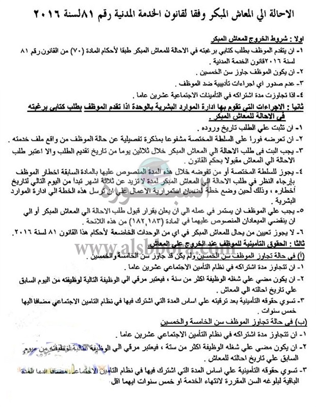 ينشر موقع السبورة الشروط الواجب اتباعها فى حال الخروج المبكر على المعاش للعاملين والموظفين بالدولة الاجراءات التى تقوم بها ادارة الموارد البشرية، بالاضافة الى الحقوق التأمينية للموظف عند الخروج على المعاش المبكر.