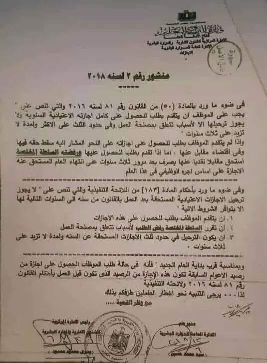 اصدرت وزارة التربية والتعليم الفنى منشورا جديدا رقم 2 لسنة 2018، بشأن صرف المقابل المادى للمعلمين من رصيد الاجازات الاعتيادية والشروط الواجب توافرها لصرف هذه الاجازات.