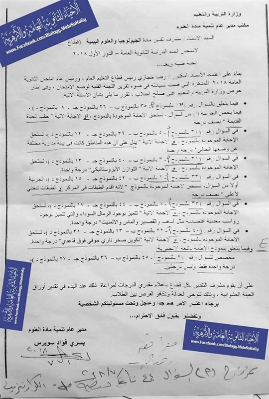 اعلن مكتب مستشار العلوم عن تعديل 6 اجزاء من نموذج امتحان مادة الجيولوجيا والتى ادى فيها طلاب الثانوية العامة امتحانهم امس الأحد، حيث ظهرت بعض الاجابات التى تحمل معنيين.