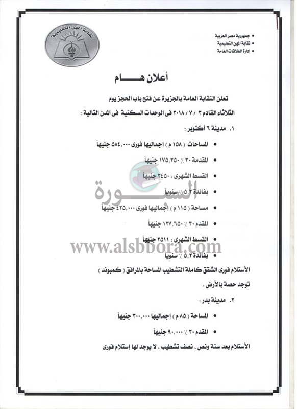 "نقابة المعلمين" تعلن عن فتح باب الحجز لشقق سكنية غدا.. ننشر الشروط والتفاصيل