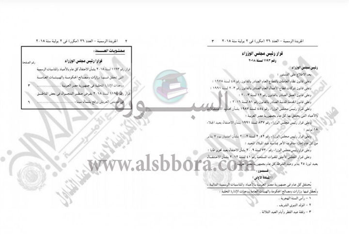 بشأن الاحتفال كل عام بالأعياد والمناسبات التى تعطل فيها وزارات ومصالح الحكومة والهيئات