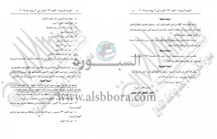 وتضمن القرار الوزارى، الأعياد وعددهم خمسة