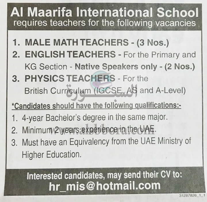 تعلن مدرسة خاصة في دولة الإمارات عن وظائف جديدة للمعلمين والمعلمات وذلك وفقا لنص الإعلان التالي: