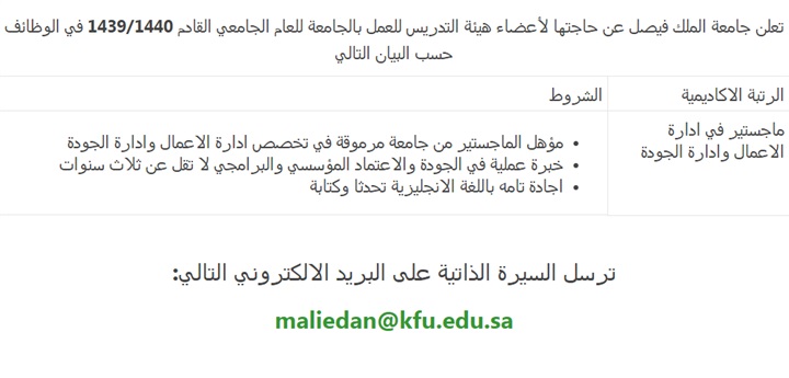 تعلن جامعة الملك فيصل عن حاجتها لأعضاء هيئة التدريس للعمل بالجامعة للعام الجامعي القادم 2019/2018، وعلى الراغبين فى التقدم ارسال السيرة الذاتية عبر الايميل المنشور فى الاعلان التالى: