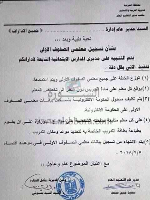 أصدرت وزارة التربية والتعليم والتعليم الفني بشأن معلمي الصفوف الاولي علما بأن أخر موعد للتنفيذ الخميس المقبل.