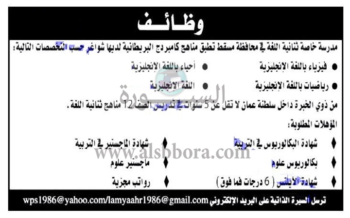 تعلن مدارس مسقط العمانية عن وظائف جديدة للمعلمين والمعلمات بمرتبات مغرية وذلك وفقا لنص الإعلان التالي: