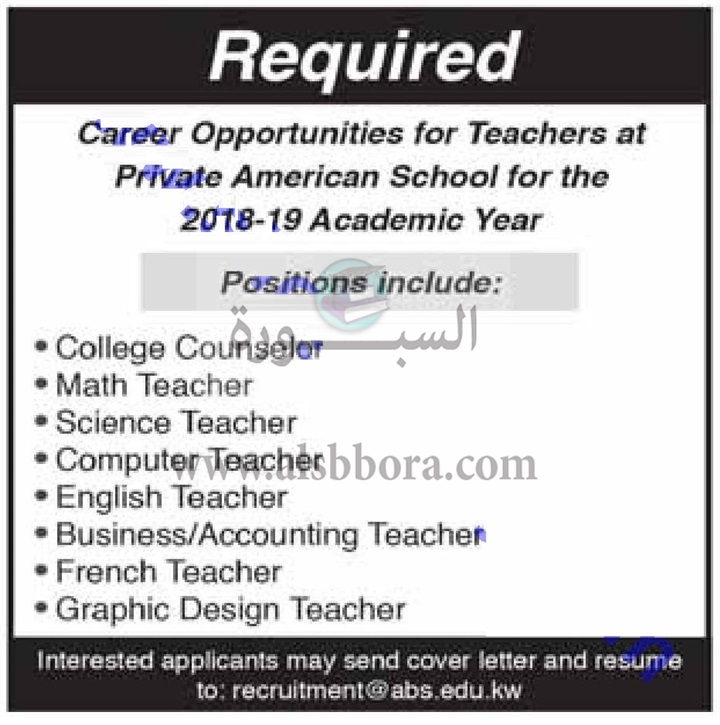 تعلن مدرسة خاصة في الكويت تعلن عن وظائف جديدة للمعلمين والمعلمات في 8 مواد وذلك وفقا لنص الإعلان التالي: