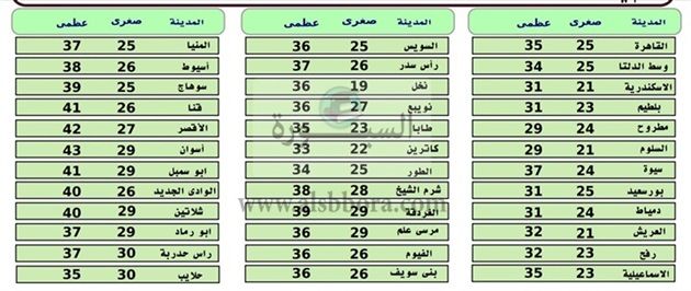 وفيما يلى بيان بدرجات الحرارة المتوقعة غدا على مدن ومحافظات مصر: