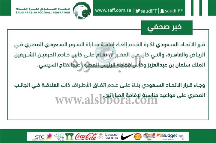 أعلن تركى آل الشيخ، رئيس الهيئة العامة للرياضة السعودية، عبر صفحته الرسمية بموقع التواصل الاجتماعى "فيس بوك"، أن الاتحاد السعودى لكرة القدم، قرر إلغاء مباراة السوبر السعودى المصرى فى الرياض والقاهرة، والتى كان من المقرر أن تقام على كأس خادم الحرمين الشريفين الملك سلمان بن عبد العزيز، وكأس الرئيس المصرى عبد الفتاح السيسى.