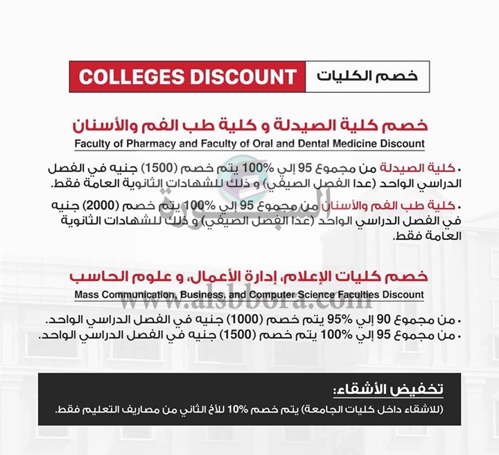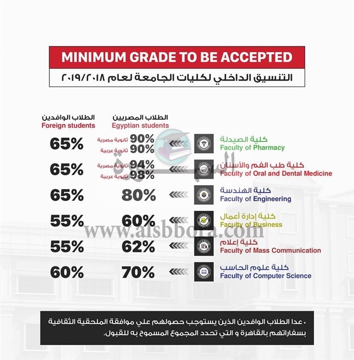وأشار رئيس الجامعة إلى أن الحد الأدنى للقبول بكلية طب الفم والأسنان "ثانوية عامة مصرية" 94%، وكلية الصيدلة 90%، والهندسة 80%، وعلوم الحاسب 70%، والإعلام (إنجليزى وعربى) 62%، وإدارة الأعمال 60%.