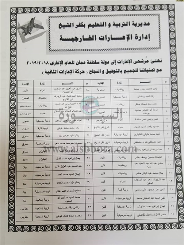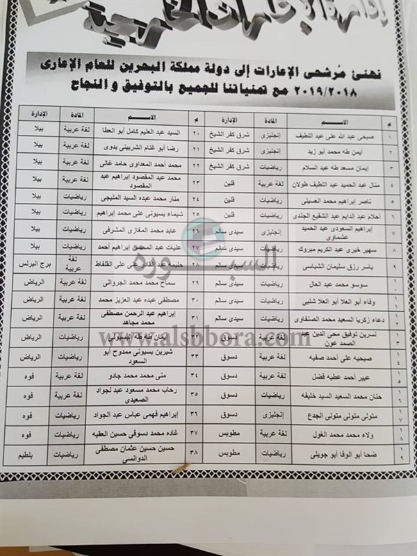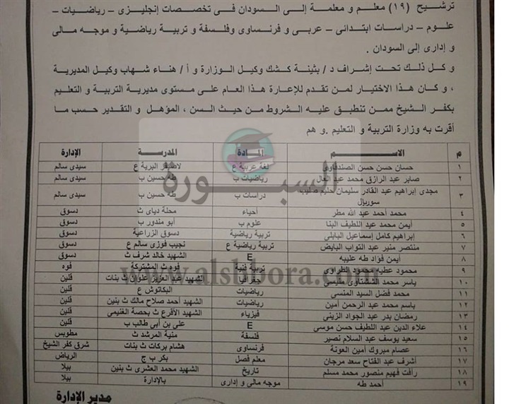 أعلنت مديرية التربية والتعليم بكفر الشيخ ، عن انطباق شروط الإعارة على 91 معلماً ومعلمه لدول البحرين وسلطنةعمان والسودان ، منهم 19 معلماً ومعلمه للإعارة لدولة السودان ، و34 معلماً ومعلمة لدورة عمان ،و38 معلماً ومعلمة لدورة البحرين.