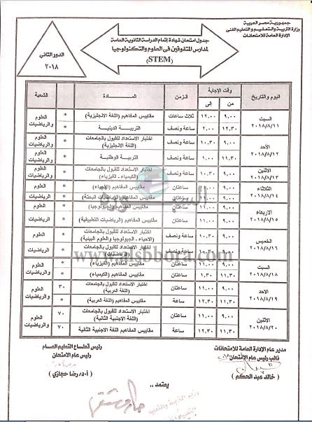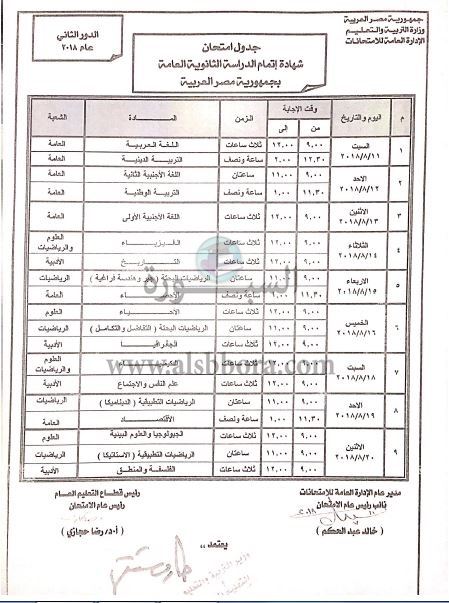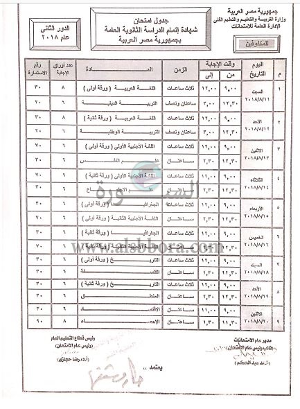 صرح الإعلامي أحمد خيري المتحدث الرسمي باسم وزارة التربية والتعليم والتعليم الفنى بأن الأستاذ الدكتور طارق شوقي وزير التربية والتعليم والتعليم الفني اعتمد جدول امتحان الدور الثاني من شهادة إتمام الدراسة الثانوية العامة بجمهورية مصر العربية للعام الدراسي الحالي 2017/2018، وذلك لطلاب الثانوية العامة والمتفوقين والمكفوفين .