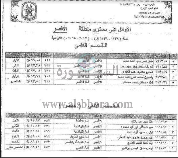 وجاءت أسماء الطلبة كما يلى على مستوي منطقة الأقصر - علمي "عمر نصر سيداحمد أحمد معهد الشيخ الأمير الأقصر بمجموع 99,08 % الأول ، وشريف محمد جابر سيد أحمد معهد الدير بمجموع 97,28 % الثانى ، ضحى محمود أحمد معهد فتيات الطود بمجموع 97.08 الثالث ، و ياسمين محمد على أحمد معهد فتيات الأمير بمجموع 93,69 % الرابع ،أمل مصطفى أحمد مصطفى معهد فتيات الأقصر بمجموع 93,54% الخامس".