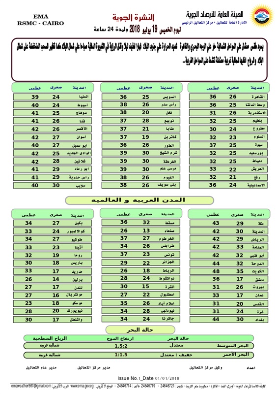 وتقل الرؤية فى الشبورة المائية صباحا على شمال البلاد ، كما تظهر السحب المنخفضة على شمال البلاد ، والرياح أغلبها شمالية غربية معتدلة تنشط على السواحل الغربية .