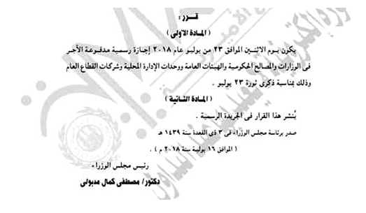 ننشر.. قرار مجلس الوزارء باعتبار الاثنين القادم اجازة رسمية
