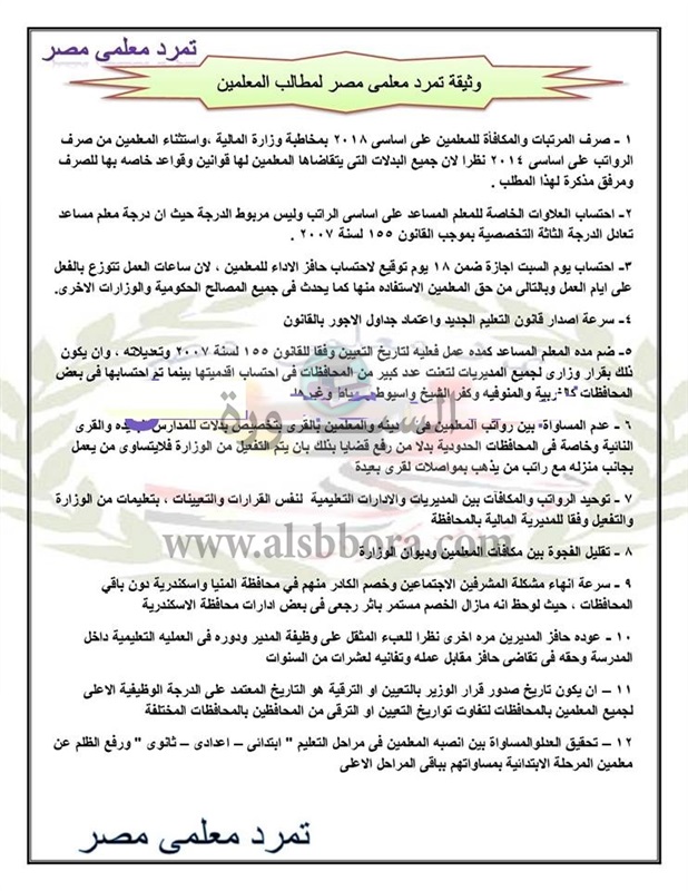 ننشر وثيقه مطالب المعلمين التي ستعرض علي الوزارة نهاية الأسبوع: " احتساب الأساسى على 2018 - ضم المدة على الترقية - ضم المعلم المساعد وعلاواته على الأساسى"