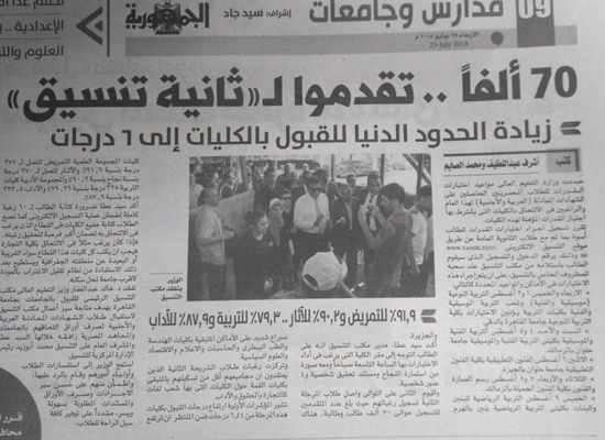 كشفت المؤشرات الأولية للمرحلة الثانية فى تنسيق طلاب الثانوية العامة ارتفاع الحدود الدنيا الى 6 درجات مما أدى ارتفاع القبول بكليات التمريض الى 92% تقريبا، اما بخصوص كلية الاثار 370 درجة بنسبة 90.2% .. وفى المجموعة الأدبية التربية 325 درجة بنسبة 79.26% والاداب 323.5 بنسبة 87.9%.