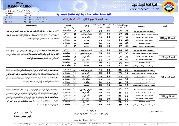 وبالنسبة لدرجات الحرارة المتوقعة غدا الجمعة بالقاهرة العظمى 36 والصغرى 26 ، والإسكندرية العظمى 32 والصغرى 25 ، ومطروح العظمى 29 والصغرى 24 درجة.