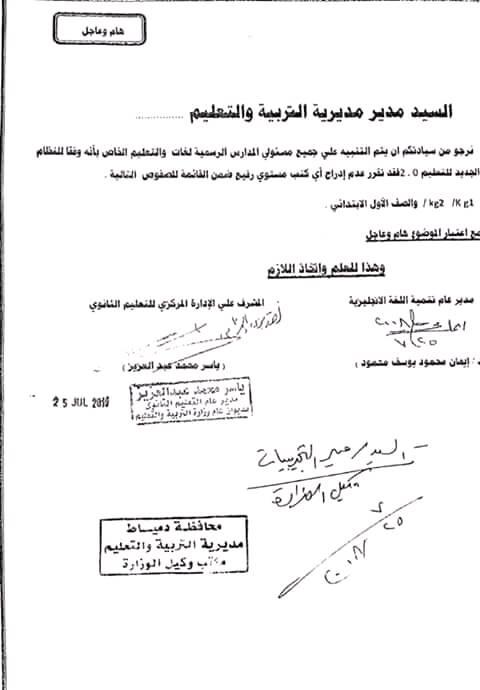 ارسلت وزارة التربية والتعليم منشورا الى جميع المديريات على مستوى الجمهورية ترجوا فيه ان يتم التنبيه على جميع مسئولى المدارس الرسمية لغات والتعليم الخاص بانه وفقا للنظام التعليمى الجديد فقد تقرر عدم ادراج اى كتب مستوى رفبع ضمن القائمة للصفوف kg1/ kg2، والصف الأول الابتدائى، على اعتبار الموضوع هام وعاجل.
