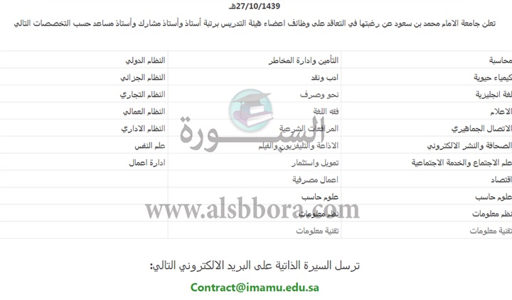 تعلن جامعة الامام محمد بن سعود عن رغبتها في التعاقد على وظائف اعضاء هيئة التدريس برتبة أستاذ وأستاذ مشارك وأستاذ مساعد حسب التخصصات التالية: