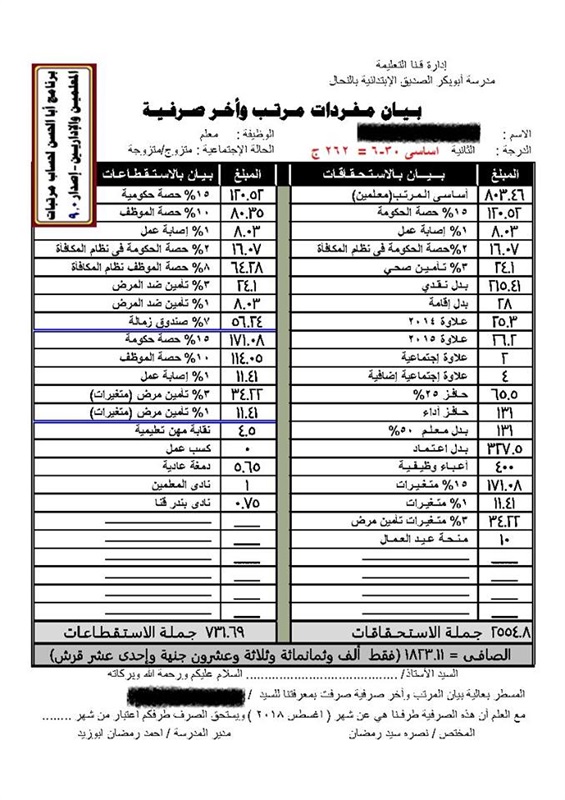 ينشر موقع السبورة مفردات مرتب لمعلم عن شهر أغسطس بعد ضم علاوات يوليو والدورية والاستثنائية.