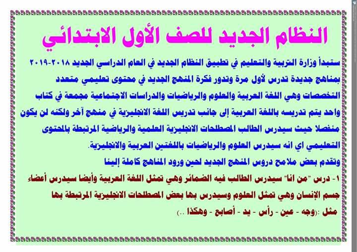 ينشر موقع السبورة ملامح النظام الجديد للصف الأول الابتدائى للعام الدراسى 2019/2018، والذى سوف يتم تطبيقه خلال العام المقبل، والذى جاء كالتالى: