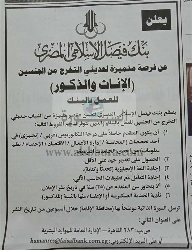 يعلن بنك فيصل عن وظائف جديدة لخريجي الجامعات وذلك وفقا للشروط والتفاصيل الواردة في نص الإعلان التالي: