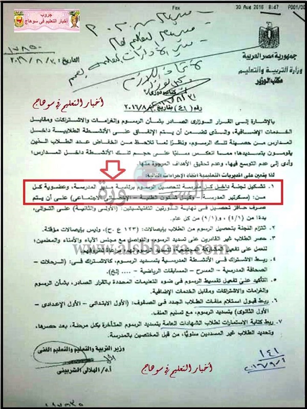 تشكيل لجنة داخل كل مدرسة لتحصيل الرسوم ( برئاسة مدير المدرسة، وعضوية كل من سكرتير المدرسة ووكيل شئون الطلبة والإخصائي الاجتماعي.)