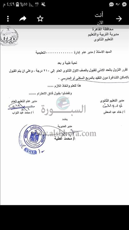 أصدرت مديرية التربية والتعليم بمحافة القاهرة قرارا بالنزول بالحد الأدني للقبول بالثانوية العامة إلي 210 درجة دون التقيد بالمربع السكني