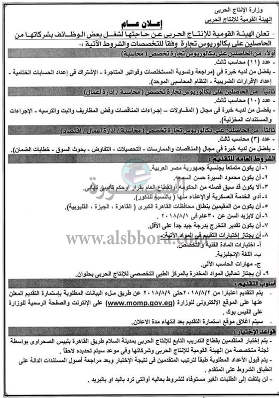 وزارة الانتاج الحربي تعلن عن وظائف جديدة لخريجي الجامعات.. ننشر نص الإعلان