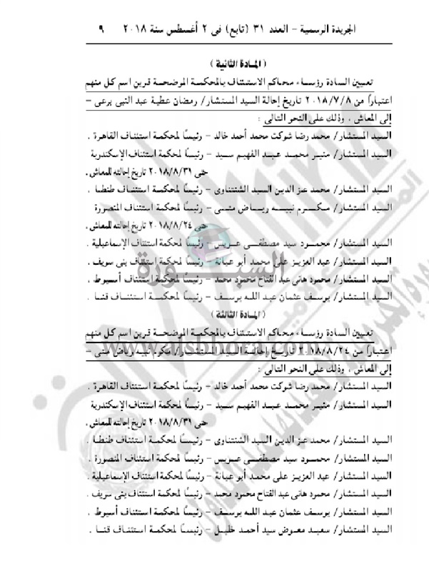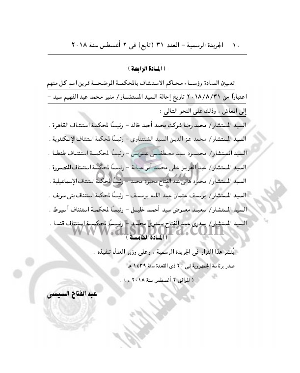 وتضمنت المادة الأولي من القرار، المنشور في الجريدة الرسمية، بعددها الصادر اليوم الجمعة، تعيين كل من المستشارين رؤساء محاكم الاستئناف بالمحكمة اعتباراً من 1/7/2018 حتي 7/7/2015 وذلك علي النحو التالي:-