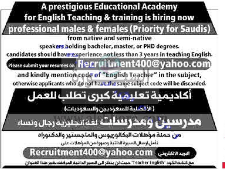 تعلن مؤسسة تعليمية بالسعودية عن وظائف جديدة لحملة الماجستير والدكتوراه وذلك وفقا لنص الإعلان التالي: