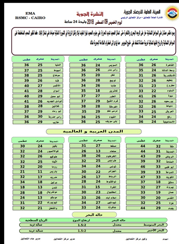 وجاءت درجات الحرارة حسب ما أعلنته الهيئة العامة للأرصاد الجوية كما يلى:
