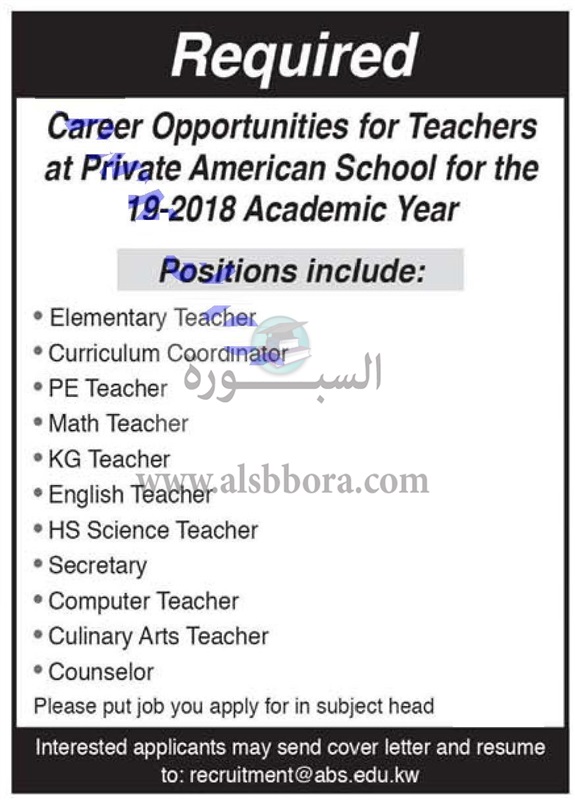 تعلن مدرسة خاصة في دولة الكويت عن وظائف جديدة للمعلمين والمعلمات في جميع المواد وذلك وفقا لنص الإعلان التالي: