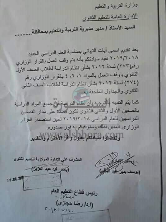 الدراسيين للعام الدراسى 2018/ 2019 لحين استصدار القرار الوزارى المبين لذلك