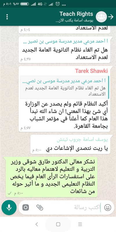 صرح الدكتور طارق شوقى وزير التربية و التعليم عبر جروب واتس آب منظمة “تيتش رايتس” بأن النظام التعليمى الجديد قائم ولم يصدر عن الوزارة أى تصريحات بشأن تأجيله أو إلغائه.