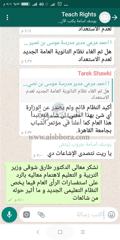 حيث رد شوقي علي تسأل لمدير مدرسة عبر جروب واتس آب منظمة “تيتش رايتس” عن حقيقة تأجل أو الغاء تطبيق النظام الجديد