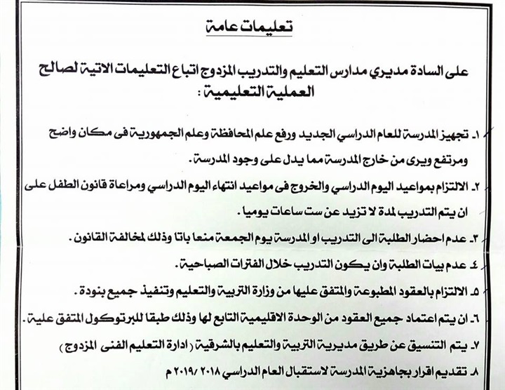 اعلنت وزارة التربية والتعليم والتعليم الفنى عن عدد من التعلميات الهامة على مديرى مدارس التعليم والتدريب المزدوج اتباع التعليمات الآتية لصالح العملية التعليمية، والى جاءت كالتالى: