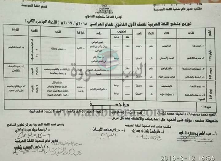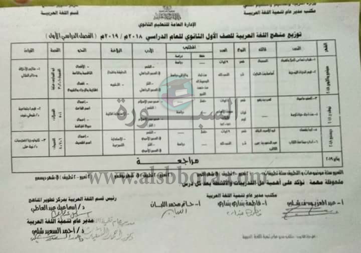 اعلنت وزارة التربية والتعليم والتعليم الفنى، عن توزيع منهج اللغة العربية للفصلين الأول والثانى للصف الأول الثانوى العام 2019/2018، حيث جاء توزيع المنهج كالتالى: