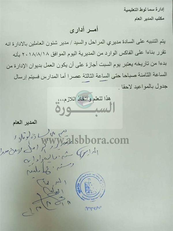 بالمستندات| التعليم تصدر امرا اداريا باعتبار السبت اجازة رسمية بدء من الأسبوع المقبل