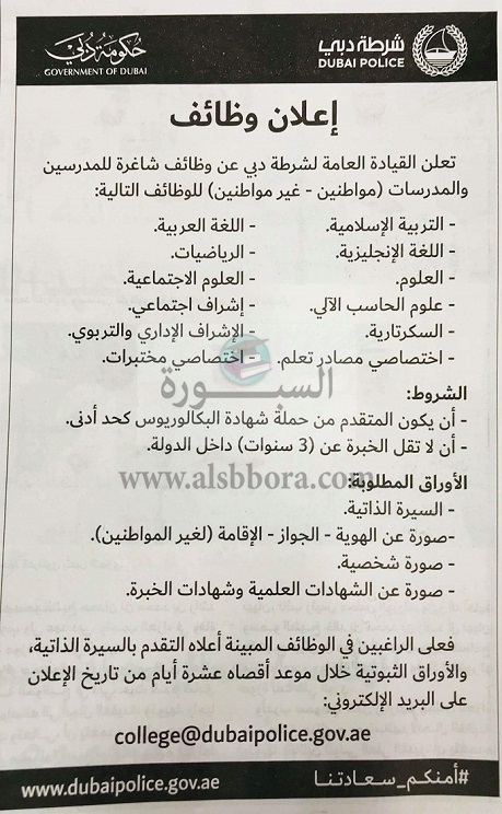 اعلنت حكومة دبى عن حاجة القيادة العامة لشرطة دبى للمدرسين والمعلمات "مواطنين وغير مواطنين" فى جميع التخصصات اللغة العربية والتربية الاسلامية واللغة الانجليزية والرياضات والعلوم والعلوم الاجتماعية وعلوم الحاسب الالى واشراف اجتماعى والسكرتارية والاشراف الادارى والتربوى واخصائى مصادر تعليم واختصاصى مختبرات